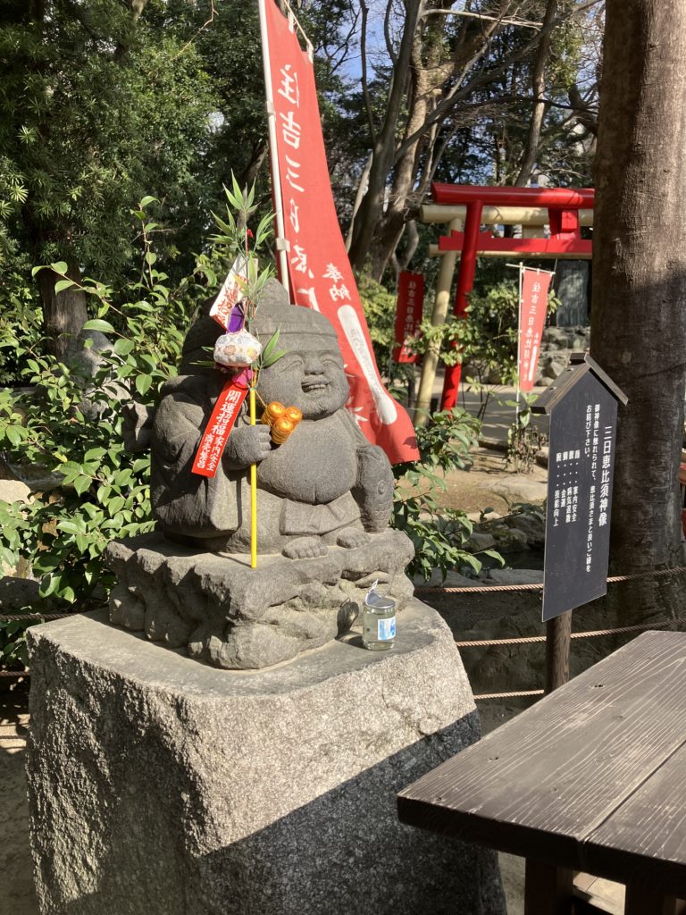 福岡の三日恵比寿神社にある恵比寿様。腕を触ると技術向上の御利益があるようで、ガッチリ触らせてもらいました。