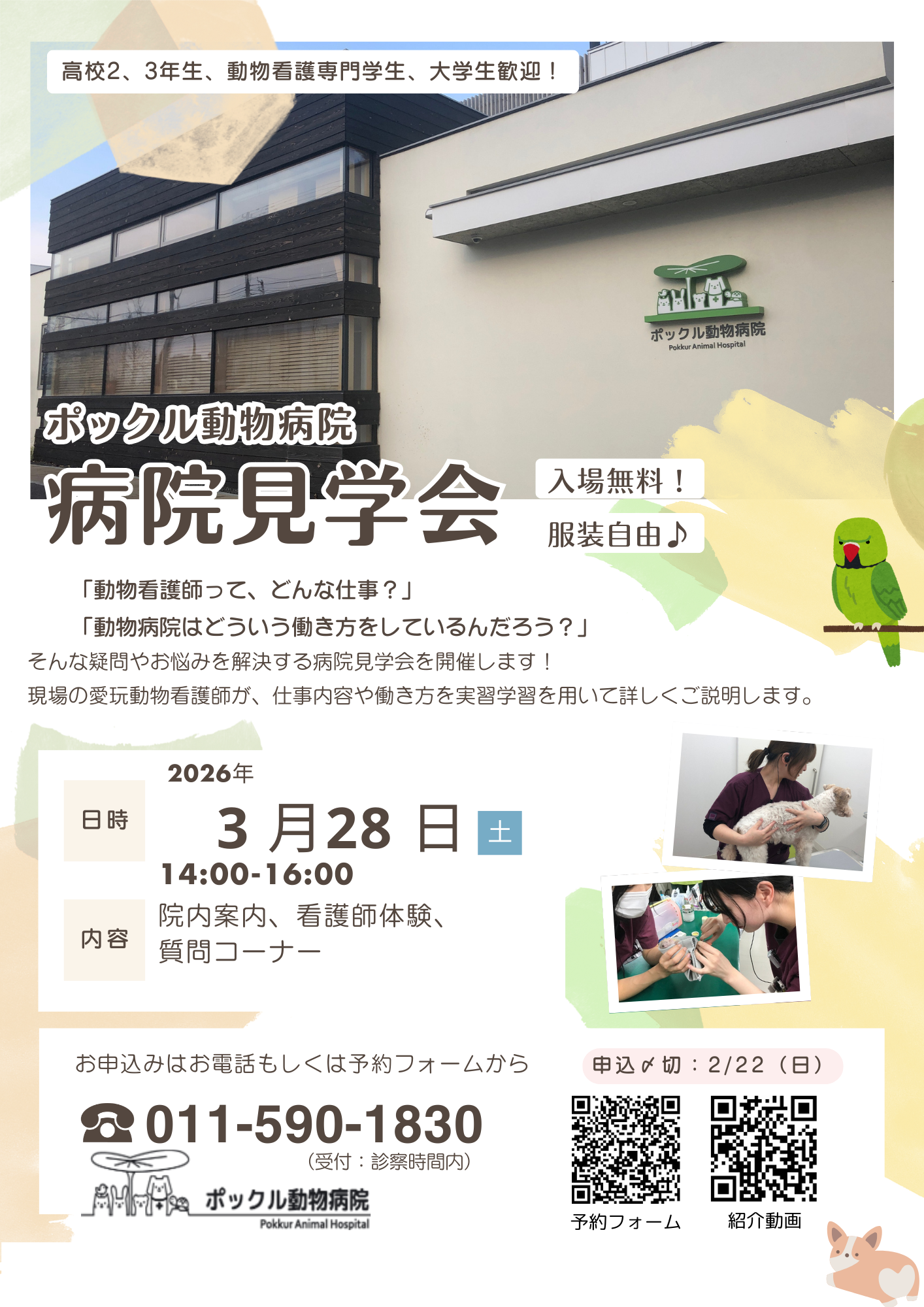 1つ目は、ポックル動物病院見学会です♪高校生、愛玩動物看護専門学生・大学生など愛玩動物看護師に興味がある方向けのイベントとなります!未来の獣医師でもOKです♪